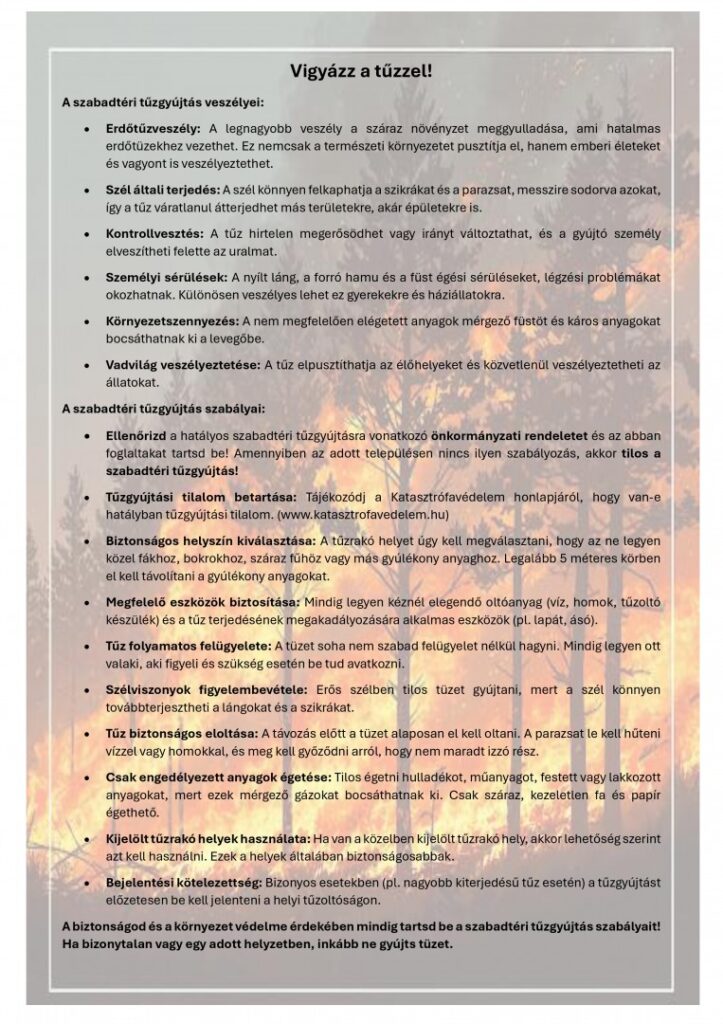 A biztonság és a környezet védelme érdekében mindig tartsuk be a szabadtéri tűzgyújtás szabályait! Ha bizonytalan egy adott helyzetben, inkább ne gyújtson tüzet!
