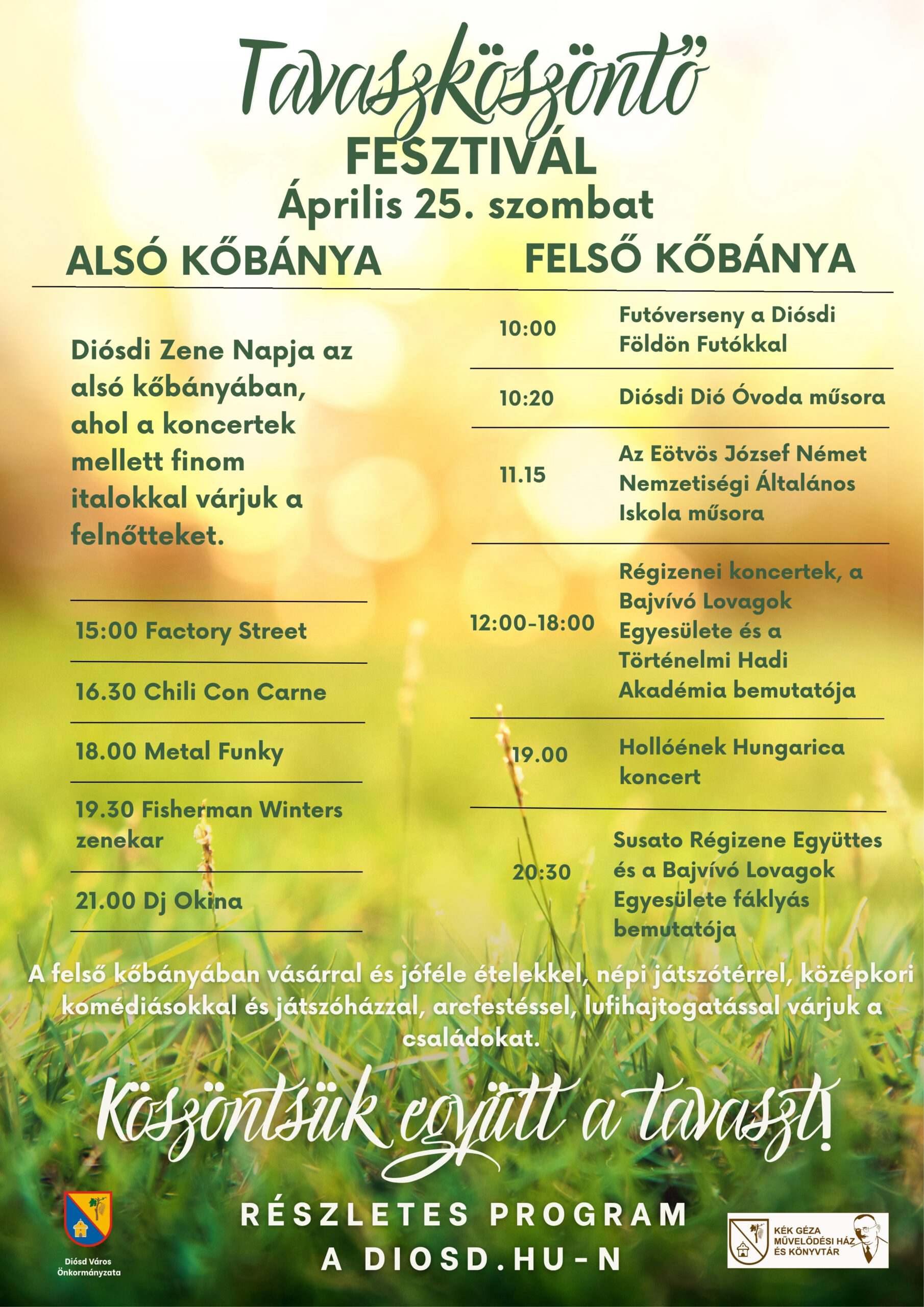 A Tavaszköszöntő Fesztivál részeként április 25-én, szombaton a hagyományőrzés lesz a főszerepben. A Diósdi Földön Futók szervezésében megvalósuló közös futást követően seregszemlével, bajvívó tornával, régizenei koncertekkel, szamuráj bemutatóval, számos gyermekprogrammal, fánkozással, vásári forgataggal és népi játékokkal várjuk a kicsiket és nagyokat egyaránt.
