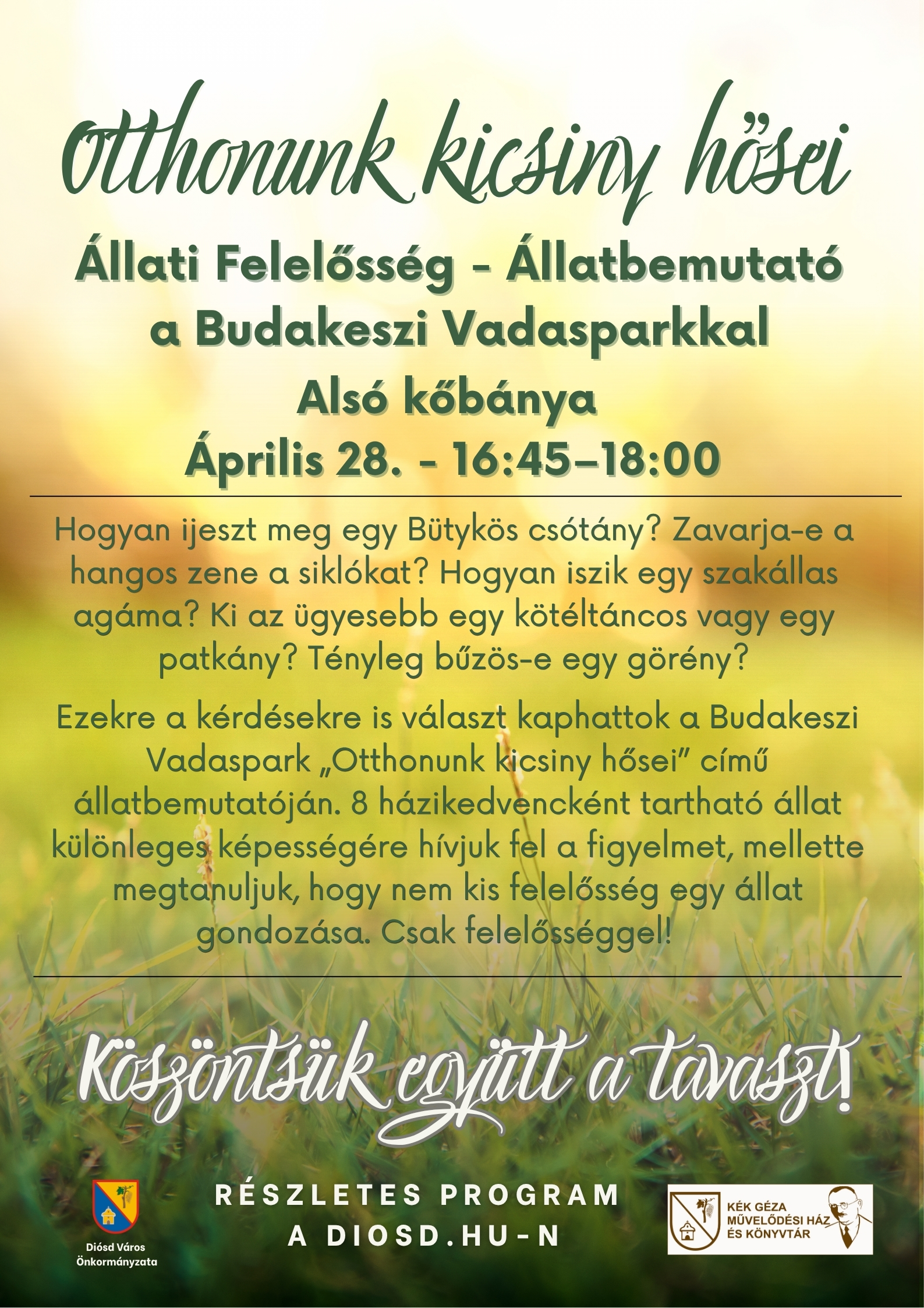 Ezekre a kérdésekre is választ kaphattok a Budakeszi Vadaspark „Otthonunk kicsiny hősei” című állatbemutatóján. 8 házikedvencként tartható állat különleges képességére hívjuk fel a figyelmet, mellette megtanuljuk, hogy nem kis felelősség egy állat gondozása. Csak felelősséggel!